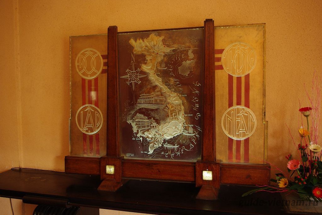 - Изготовленное вручную стеклянное панно с картой Вьетнама, которое в 1942 году императору подарили вьетнамские студенты, обучавшиеся во Франции