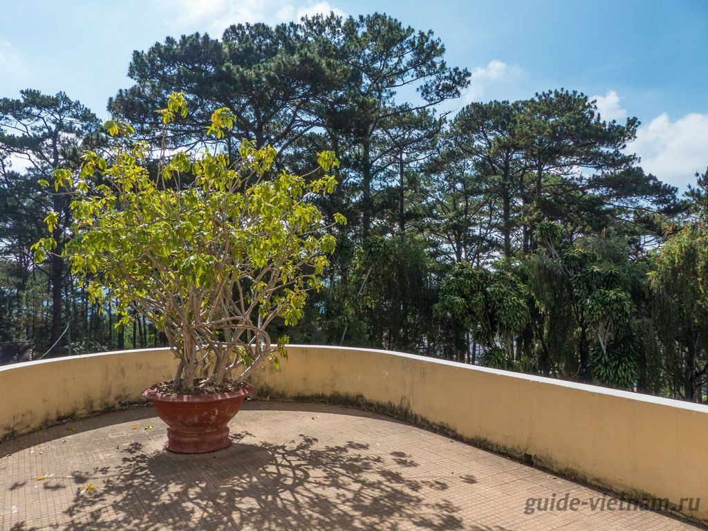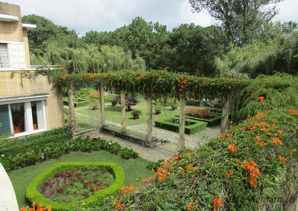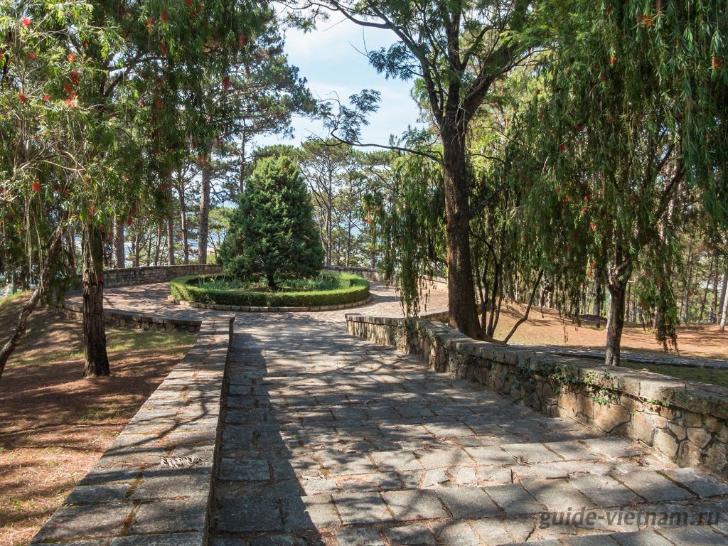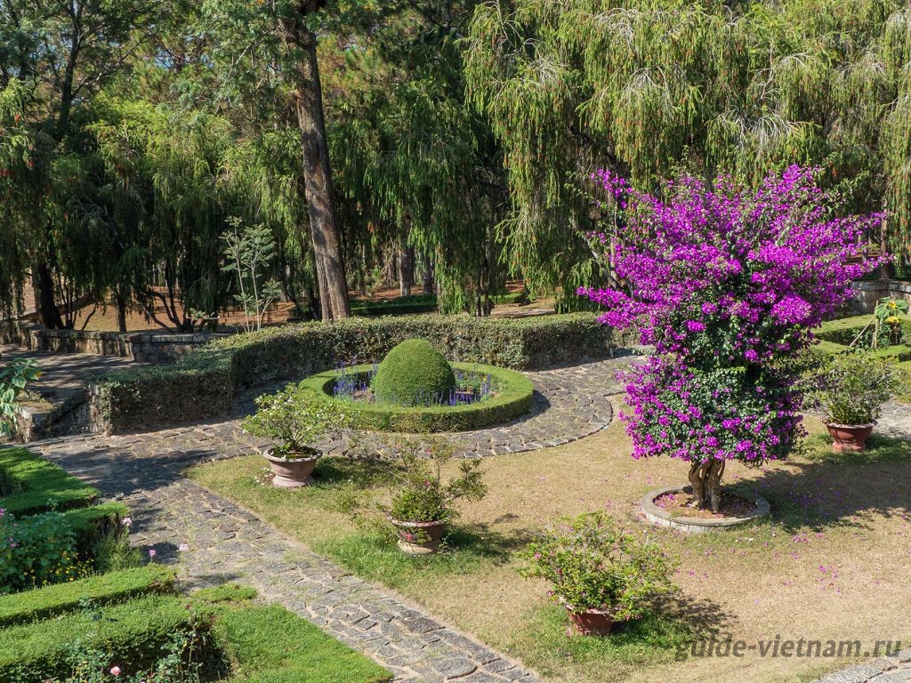 Пройдя внутрь, вы сразу же окажетесь в зеленом саду. Как и во всем Далате, тут много ярких цветов. Вы можете прогуляться по каменным тропинкам вдоль ухоженных газонов, фигурно постриженных кустов, высоких пальм, деревьев бонсай. Также на территории есть несколько фотопоинтов, где вы можете сделать интересные снимки.