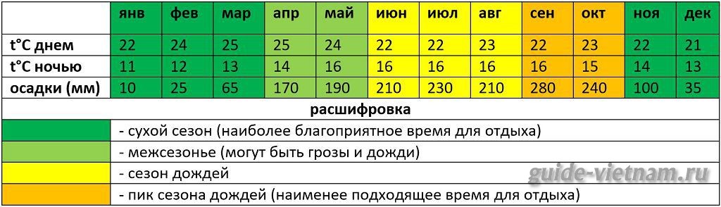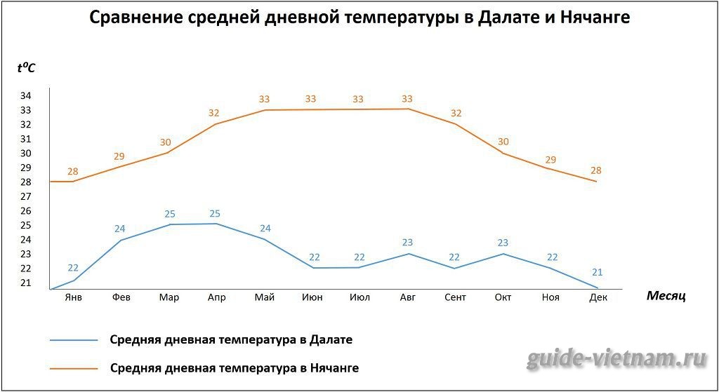 Для Вьетнама такая погода – довольно прохладная. Давайте сравним среднюю дневную температуру в Далате и в Нячанге, чтобы понимать разницу:
